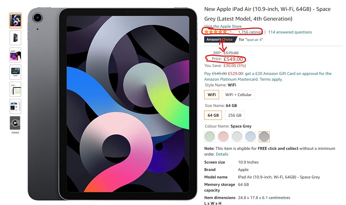 We recommend to place customer ratings and reviews as close as possible to the price. Consumers are more encouraged to buy an item when they see that the product has high ratings. Most product pages take this motivation into account by placing the item’s rating right next to its prices. Sellers who want to encourage buyers even further to make a purchase should also consider placing the reviews close to the price as well, like in the example below: